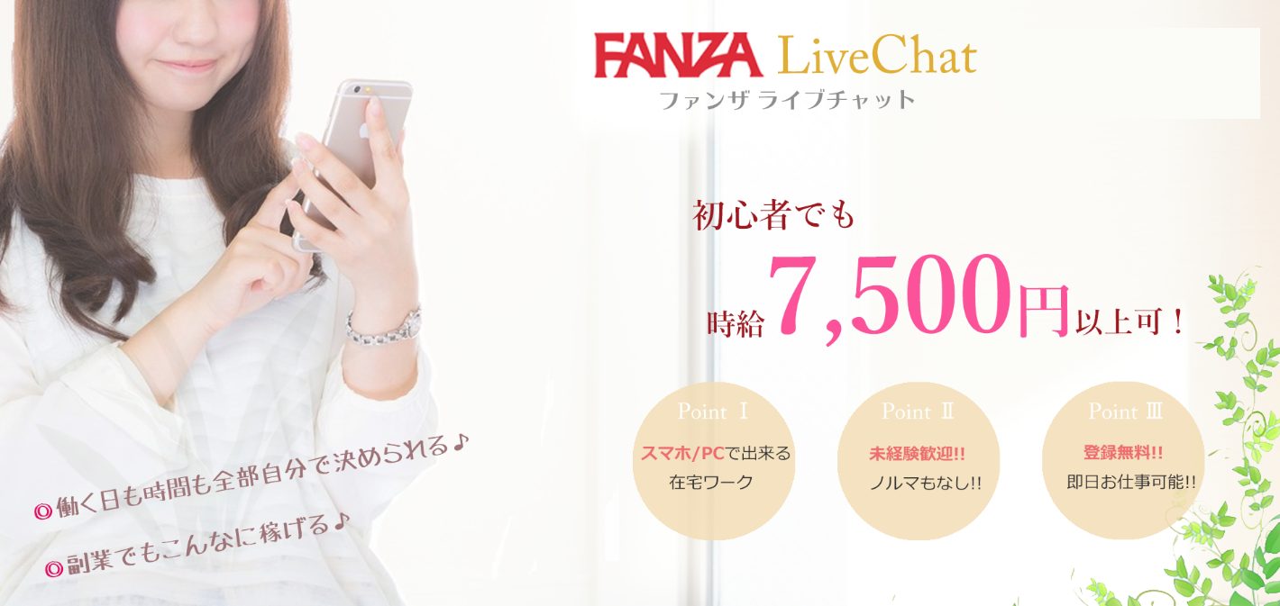 自分の好きなタイミングで稼げるFANZAの在宅チャットレディ! ノンアダルトだから安心!スマホでかんたん在宅ワーク 時給7,500円以上可、安心の個人情報対策、最短翌日振込! |